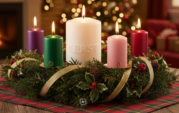 - Met Kerst wordt er midden in de krans een vijfde kaars voor zuiverheid aangestoken (wit)