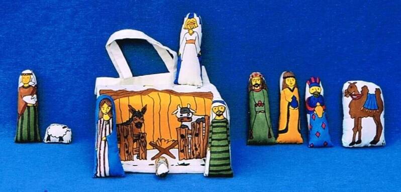 Stof, bedrukt, opgevuld, Kertsgroepfiguren met tas als stal